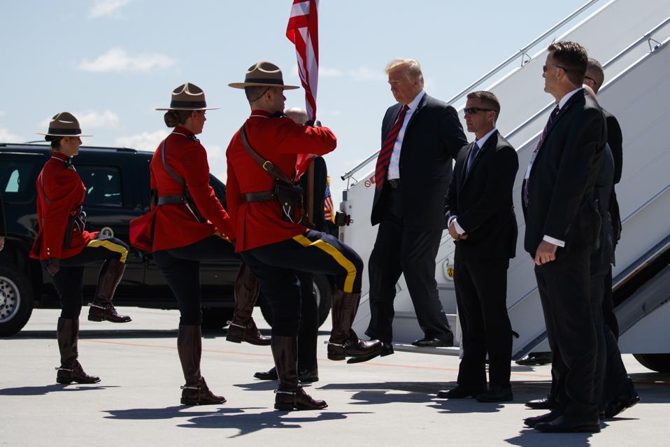 President Donald Trump steps off Air Force One as he arrives for the G7 Summit, Friday, June 8, 2018, in Canadian Forces Base Bagotville, Canada. (AP Photo/Evan Vucci)